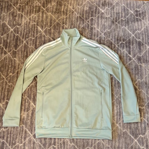 Adidas klassinen verkkatakki sinisenä, koko L. Vetoketjukiinnitys ja klassiset Adidas-raidat hihoissa. Takissa on pieni tahra etupuolella. Muuten siisti ja ehjä.
