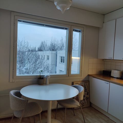 Myydään siisti ja hyväkuntoinen Veken Saini-ruokapöytä, halkaisija 110 cm. Pöydän kannessa ei kolhuja tai jälkiä. Vain nouto, koiratalous.