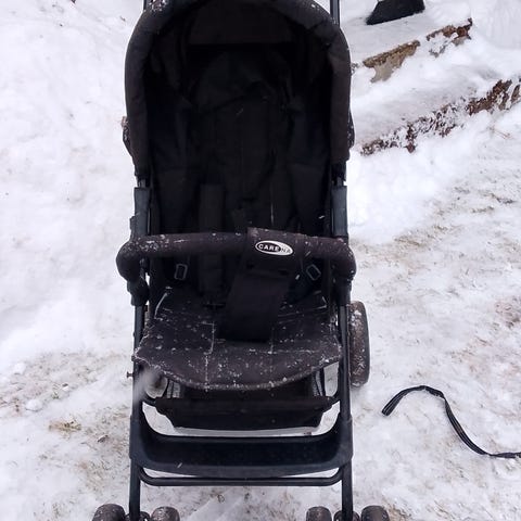Hyväkuntoiset kokoontaittuvat perusmatkarattaat kääntyvillä etupyörillä.