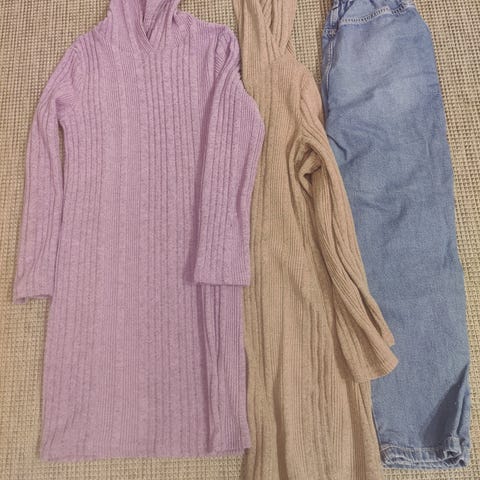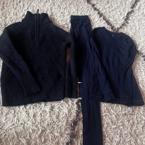 Vaatteita koossa 140 cm. Kolmet merinovillahousut, joista kahdet lähes käyttämättömiä. Peak Performance -collegehousut sekä House-reisitaskufarkut sekä camo-kuosinen fleece-setti.