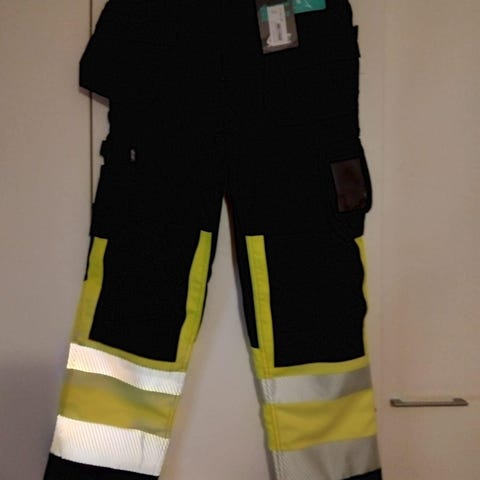 Työhousut, koko 50, musta väri, heijastavat yksityiskohdat alareunassa. Soveltuvat käytettäväksi työympäristössä, jossa näkyvyys on tärkeää.