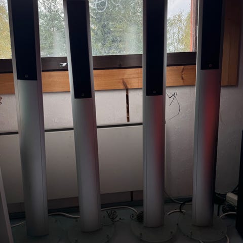 Jamo kaiutinjärjestelmä, joka sisältää viisi kaiutinta ja yhden subwooferin. Kaiuttimet ovat siistit ja sopivat esimerkiksi kotiteatterikäyttöön tai musiikin kuunteluun.