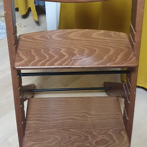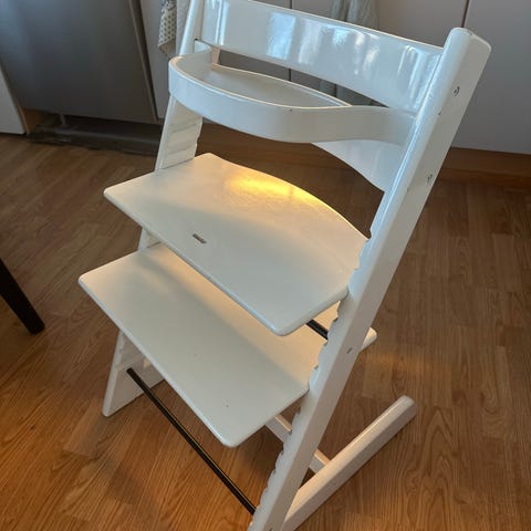 Stokke lasten tuoli, valkoinen. Tuolissa säädettävä istuin- ja jalkatuki, käytön jälkiä.