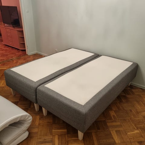 Mökkikäytössä olleet Piscina runkopatja/runkopatjasänky 2 kpl 90x200, vaaleat lakatut suorakaiteen muotoiset puujalat. . Hinta molemmat yhteensä.
