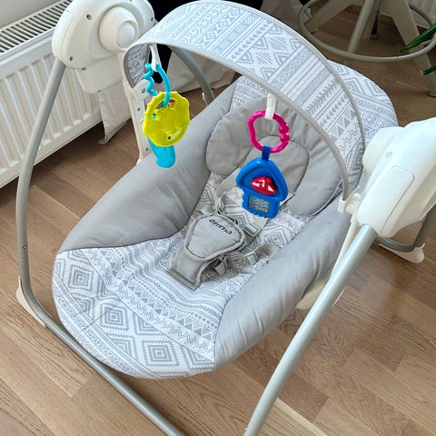 Vähän käytetty Emma vauvakeinu delight. Lelukaaren toinen lelu hukkunut. Toimii sekä paristoilla että verkkovirralla.