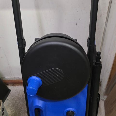 Nilfisk Core 125 painepesuri, sininen väri, varustettu pitkällä virtajohdolla ja pyörillä liikuteltavuuden helpottamiseksi. Soveltuu erilaiseen puhdistukseen kotitalouksissa ja ulkona.