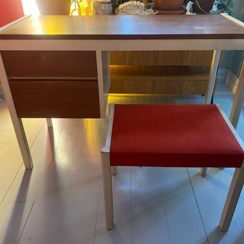 Lasten puinen koulupöytä ja tuoli vaaleansinisessä värissä. Pöydässä on kansi, joka avautuu säilytystilaksi. Kaluste soveltuu lasten käyttöön ja tarjoaa käytännöllisen työskentelyalueen. Maalausjälki epätasainen, huomioitu hinnassa :) saa varmasti hiottua ja uudelleen maalattua jos häiritsee