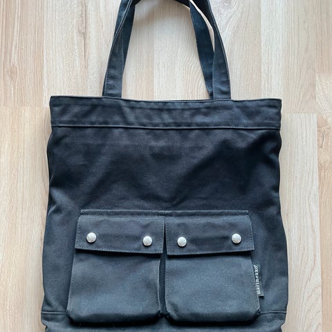 Tummansininen paksusta farkkukankaasta valmistettu isohko olkalaukku. Leveys 38 cm ja korkeus 26 cm.Kaksi vetoketjullista osastoa. Vetoketjut metallia ja toimivat.