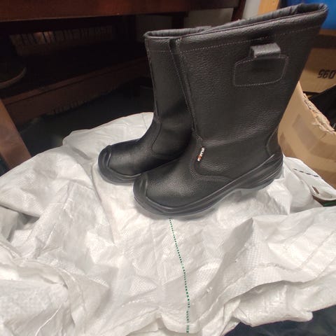 Käännös englanninkieliseltä nettisivulta: "Mustat, vettähylkivät, pigmentoidusta nahasta valmistetut saappaat, joissa on ekologinen villavuori. T-leveä, synteettinen, magneetiton kärkisuoja SafeFlex-metallittomalla lävistyssuojalla. 2D-polyuretaanipohja Spunterbo-etupohjalla."