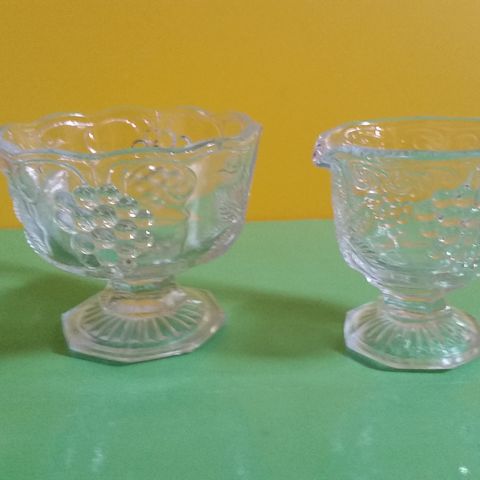 Riihimäen lasin sirot pienet Rypäle-sokerikko ja kermakko yht. 8€. Ehjät ja siistit. Sokerikon kork. 8cm ja halk. 9cm. Kermakon kork. 7cm ja vetoisuus hieman alle 1dl. Näitä ei ole juurikaan käytetty, kaapissa olleet. Nouto Vaasa