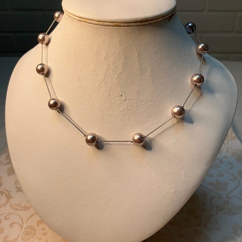 Ruskea metallinen pampulakaulaketju. Ketjun pituus pisimmillään n. 100 cm. Pampulan halkaisija n. 0,9 cm. Moitteeton kunto.