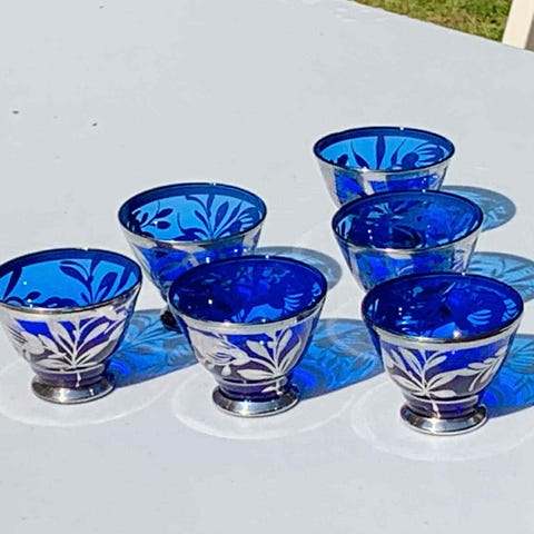 Kaunis, koristeellinen viinikarahvi ja viisi lasia, joissa on ilmeisesti kullatut koristeet. Pullo on korkea ja kapea, lasit ovat pieniä ja sopivat esimerkiksi liköörin tai makean viinin tarjoiluun. Sarja soveltuu koristekäyttöön tai juomien tarjoiluun.