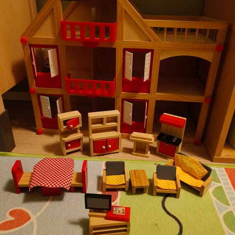 lasten leikkihuoneen puiset kalusteet sisältäen pyöreän ja suorakaiteen muotoisen pöydän, tuoleja, nojatuolin ja lipaston. Kalusteet ovat puuta, luonnonvärisiä ja tarkoitettu lasten leikkeihin.
