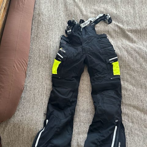 Yoko Jätkä vedenpitävät moottoripyöräilyhousut. koko L ja ovat todella hyvässä kunnossa. Niiden mukana tulee lisäksi talvivuori, henkselit ja iskusta kovettuvat vaahtomuovisuojat (lantio- ja polvisuojat).