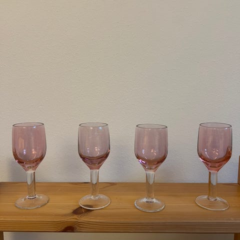 Myydään vaaleanpunaiset ( opaal rose) mattalasi liköörilasit, vintage lasit 1900 - luvun puoliväli, lasin korkeus 11,5cm, vetolisuus 70ml. Saatavilla 6 kpl yhteensä 12 euroa, kaupan päälle lisälasi