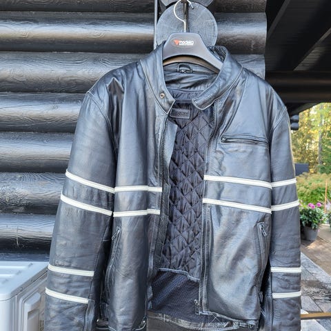 -Hanx ajotakki irroitettavalla vuorella, sekä tähän kuuluvat housut. Takissa suojat olka- ja kyynärpäissä, sekä selkäsuoja. Housuissa ainakin polvisuojat. Koko XXL, mutta vastaa pienempää kokoa (L/XL), paitsi housut menee isommallekkin kaverille. Hyvät kamppeet kevät / syksy keleille. Kuvat 1-4.