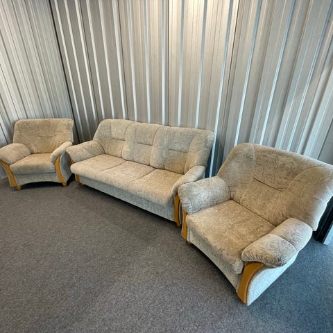 Hyväkuntoinen sohvaryhmä. 3-istuttava sohva, nojatuoli ja savulasinen sohvapöytä. Nouto Espoonlahdesta