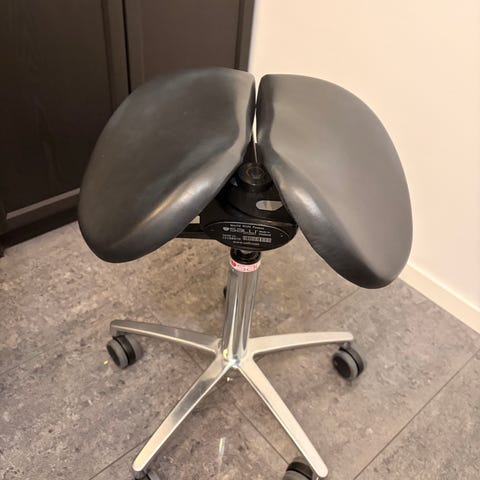 Moderni muotoilu yhdistyy käytännöllisyyteen tässä satulatuolissa. Sen musta väri ja metallinen jalusta tekevät siitä sopivan monenlaisiin työympäristöihin. Tuolissa on havaittavissa vähäistä käytön jälkeä, mikä ei kuitenkaan vaikuta sen käyttöön. Pyörät ja jalusta ovat hyvässä kunnossa