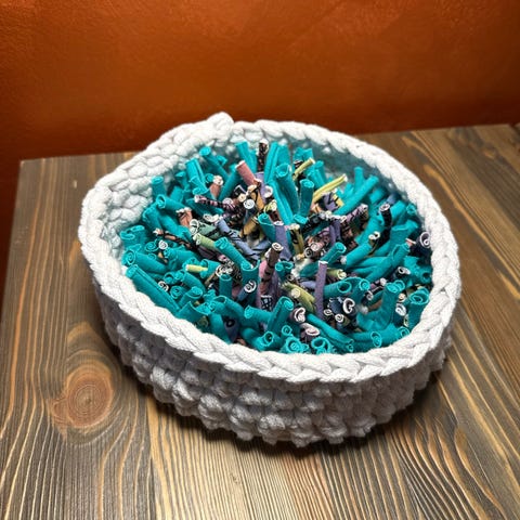 Matonkuteista, ontelokuteesta ja trikookankaasta tehty nuuskukori/aktivointikori lemmikille.