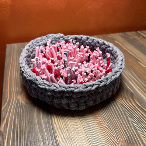 Ontelokuteesta ja trikookankaasta tehty nuuskukori/aktivointikori lemmikille.