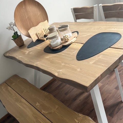 Veken kalusteesta ostettu Lana ruokailuryhmä. 6-hengen pöytä ja 2 pitkää pirttipenkkiä (200cm).