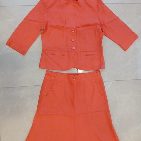 Musta liituraitapuku, jossa tummanpuna-ruskeat ohuet raidat (kuvissa värit näköjään vääristyvät; hihansuun kuvassa lähinnä todellista raitojen väriä). Takissa vuori. Koko 42.