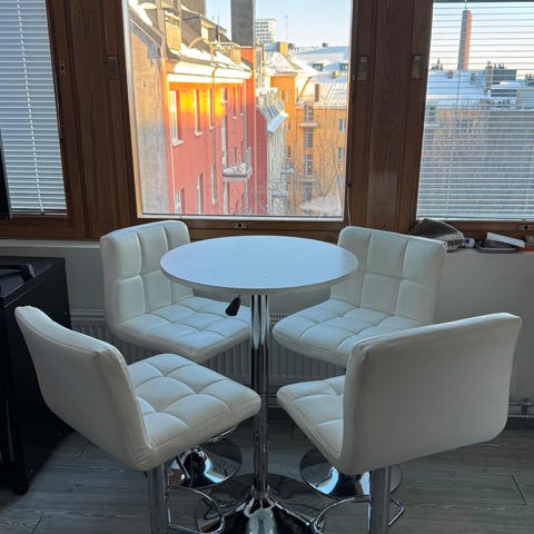 Baariruokaryhmä, johon kuuluu baaripöytä ja neljä baarijakkaraa. Pöydässä on yhdellä sivulla muutossa tullutta maalin kulumaa, kts. kuvat 4 & 5, baarijakkarat lähes uutta vastaavassa kunnossa. Ruokailuryhmä on noin neljä vuotta vanha. Vain nouto.