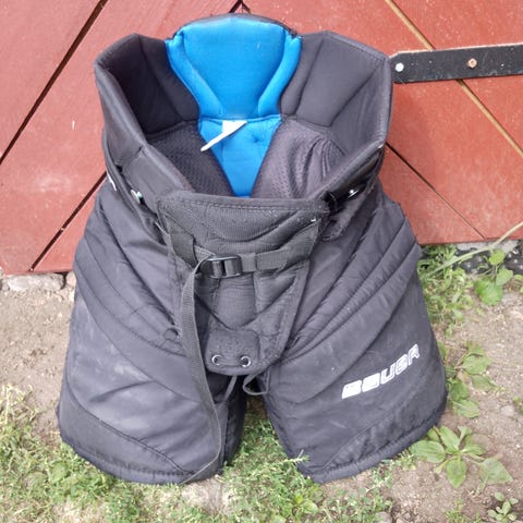 Bauer Jr. jääkiekkohousut, koko M. Koko huomattavasti reilumpi, kuin kokotaulukko housuissa antaa ymmärtää. 140cm hoikalle pelaajalle nämä olivat aivan liian isot.