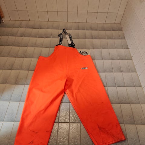 ABEKO sadehousut, avohaalari, made in finland, koko XXL, lahje 80 cm. vyötäro päältä 60+ cm. käyttäjä pit. n. 192+ cm. väljä malli eli alle mahtuu paksumpaakin vaatetta, PVC 80/PA 20%, säädettävät kyljet ja henkselit, kunto K4, käyttämättömät, nimikoitu telakka yhtiölle.