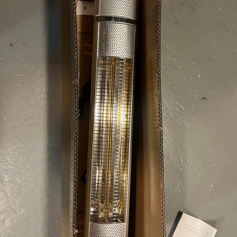 Infrapuna tekniikalla toimiva terassi tai parveke lämmitin. Ei näkyvää valoa ja näin ollen miellyttävä käyttää pimeässäkin. Teho 1800W . Johdon pituus n.3m ja ketjujen pituus n.1m.