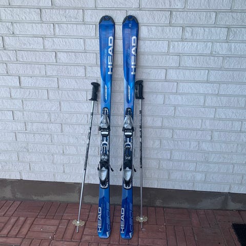 Head C160 laskettelusukset, pituus 170 cm. Sukset on varustettu Tyrolia Superlight siteillä. Mukana Scott sauvat