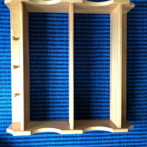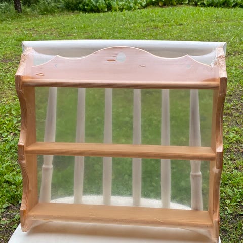 Myydään tukeva puinen seinähylly. Hyllyssä on kauniit aaltoilevat reunat ja se sopii erinomaisesti esimerkiksi maustehyllyksi keittiöön, pikkutavaroiden säilytykseen tai vaikkapa lastenhuoneeseen satukirjoille. Takana on valmiit reiät helppoa seinäkiinnitystä varten.