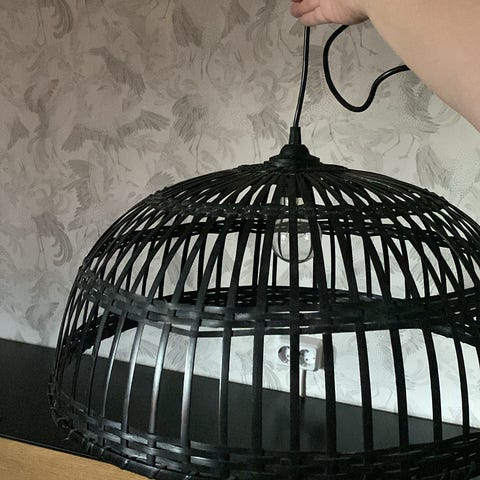 Kattovalaisin jonka korkeus on säädettävissä. Rottinkien välissä kauniit lasipanelit.