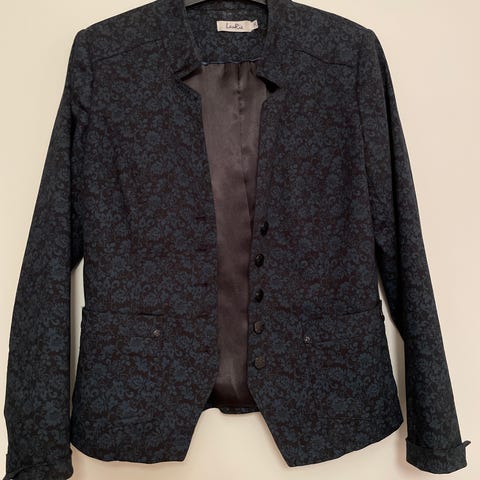 Musta vuorellinen blazeri koko 42, merkki Brandtex. Takana tamppi, jonka reunoissa erikoiset ompeleet, samoin taskujen suiden läpissä sekä kauluksen reunoissa.