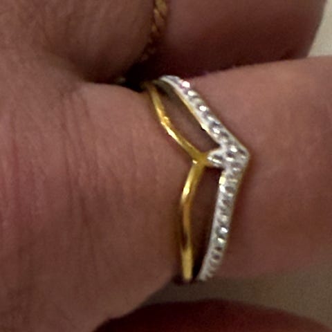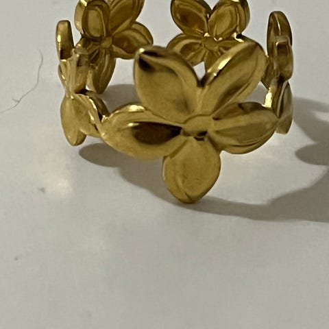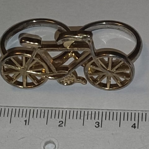 Vanha aarre, mitat kuvassa arvio 20 ja risat. Kulumaa, elämän jälkiä on. Arviotu materiaali alumiiniksi, sillä niistä puhdetyöt yleensä tehtiin. Kiven kohdalla punaista eri materiaalia kuin muu sormus.
