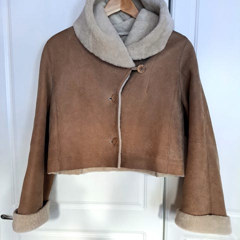 Myytävänä on naisten lämmin kelsitakki. Vaaleruskea, huppu, isot taskut, siisti.