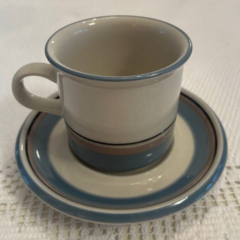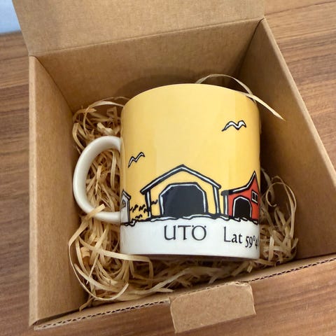 Käyttämätön Arabia Utö muki, posliinia. Mukissa on sininen taustaväri ja kuvio, jossa on majakka ja rakennuksia. Mukin pohjassa on Arabia-merkintä.