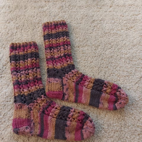 Kivat villasukat, villatöppöset koko 36-37. Uudet, itse kudotut. Lämpimät. Punaharmaat.