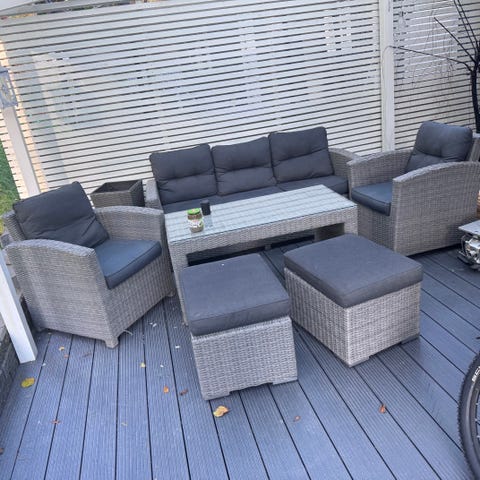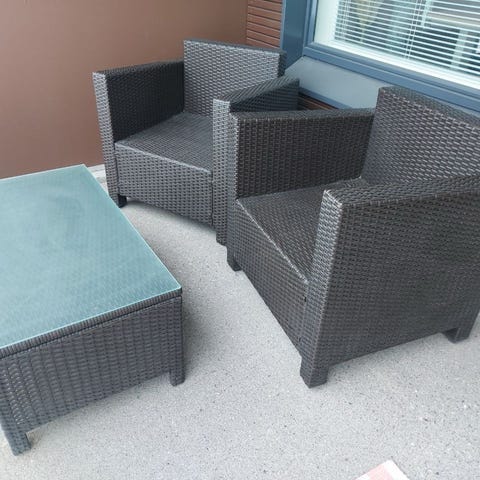 Polyrottinkinen puutarhakalustesetti, johon kuuluu kaksi tuolia ja pöytä. Tumma väri antaa modernin ilmeen, ja lasikansi lisää tyylikkyyttä. Setti on kevyt ja helppo siirtää paikasta toiseen. Sopii erinomaisesti terassille tai parvekkeelle.