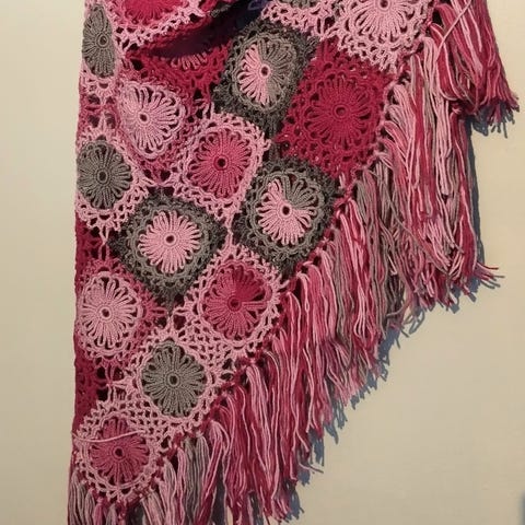 Valkoinen virkattu iso huivi, ohut villalanka,