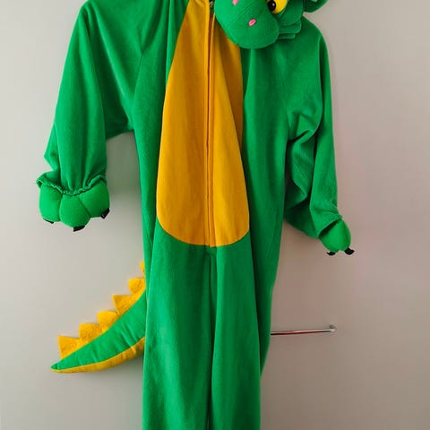 Unisex lasten dinosaurusasu, koko 3-5 vuotta. Asu on valmistettu 100 % polyesteristä ja siinä on sininen väri sekä keltainen vatsan alue. Asussa on hupullinen yläosa ja irrotettava häntä. Kankaassa muutamia selkeitä käytön jälkiä, kuten lankapako kts. Kuvat. Soveltuu lapsille leikkeihin ja pukujuhliin.