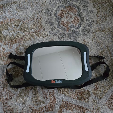 Avan autopeili mustalla kehyksellä ja säädettävällä kiinnityshihnalla. Peili on suunniteltu autoon takaistuimella matkustavien lasten valvontaan.
