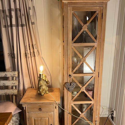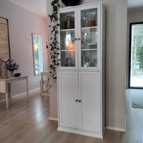 Myydään laadukas täyspuinen 2-osainen setti: Monaco-merkkinen vitriinikaappi / astiakaappi sekä alaosa senkki. Suomessa valmistetut massiivimäntyiset Monaco-huonekalut.