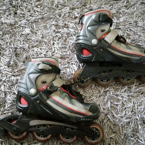 Rullaluistimet ehkä 70-luvulta. Ostettu Lontoosta 80-luvun lopulla. Kokeiltu muutama kerta, muuten olleet kaikki nämä vuodet kaapin perukoilla. Joutaa vaikka koristeeksi tai jollekkin käyttöön. Säädettävät.
