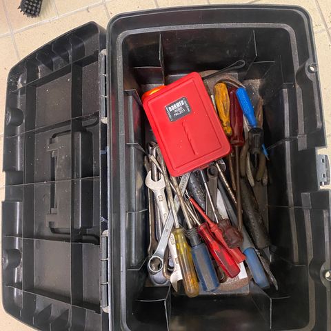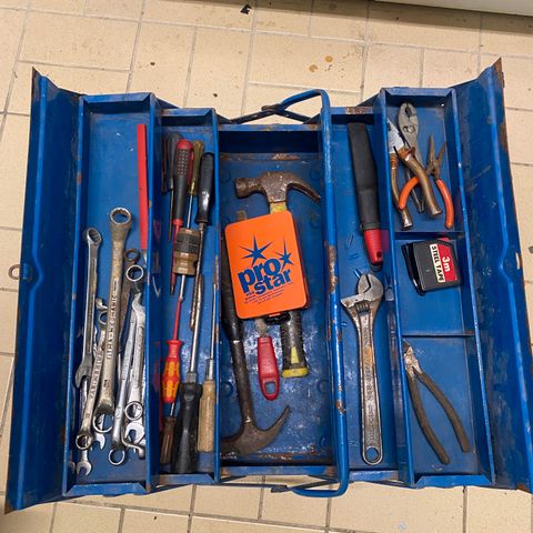 Työkalusarja sisältää mittanauhan 3m, vasaran, pihdit, ruuvimeisselit x4 (2kpl tasapää ja 2kpl ristipäisiä), kuusiokoloavaimia ja meisseli, johon 19kpl vaihtopäitä (huom 1kpl puuttuu).