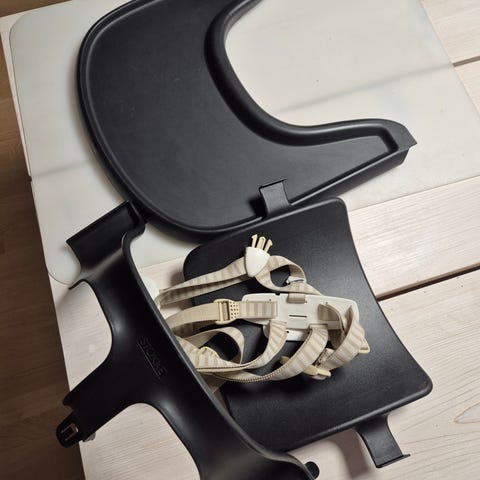 Myynnissä valkoinen Stokke tripp trapp babyset harmaalla tarjottimella.