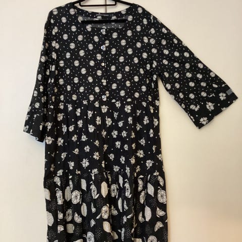 Gudrun Sjödén Ohutta puuvilla, hihat vähän pidemmät kuin 3/4. Olka-helma 113 cm, kai-kai 60 cm. Taskut sivusaumassa.