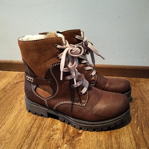 Rieker nilkkurit, koko 37, väri konjakin ruskea. Hyvässä kunnossa, kengän kärjissä pientä kulumaa.