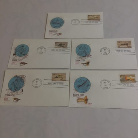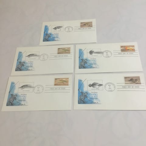 Fishing Flies -postimerkkejä sisältävä kirjekuorisarja, jossa on leimattu postileima 'First Day of Issue'. Sarja koostuu useista eri postimerkeistä ja kirjekuorista, jotka liittyvät kalastukseen ja perhoon.