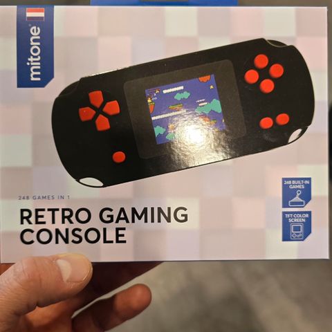 Game On pelikonsoli, jossa on pieni näyttö ja ohjausnuppi sekä useita pelipainikkeita. Konsolissa on 100 peliä. Game on pelikonsoli on retroon perustuva.